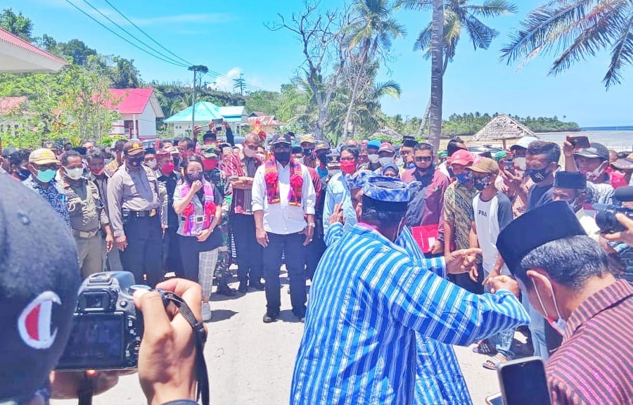 Bupati Buton Tengah Samahuddin (La Ramo), disambut Masyarakat Mawasangka Timur saat Peresmian PDAM Oeno Lia di Desa Wambuloli, Jumat (25/09/2020).