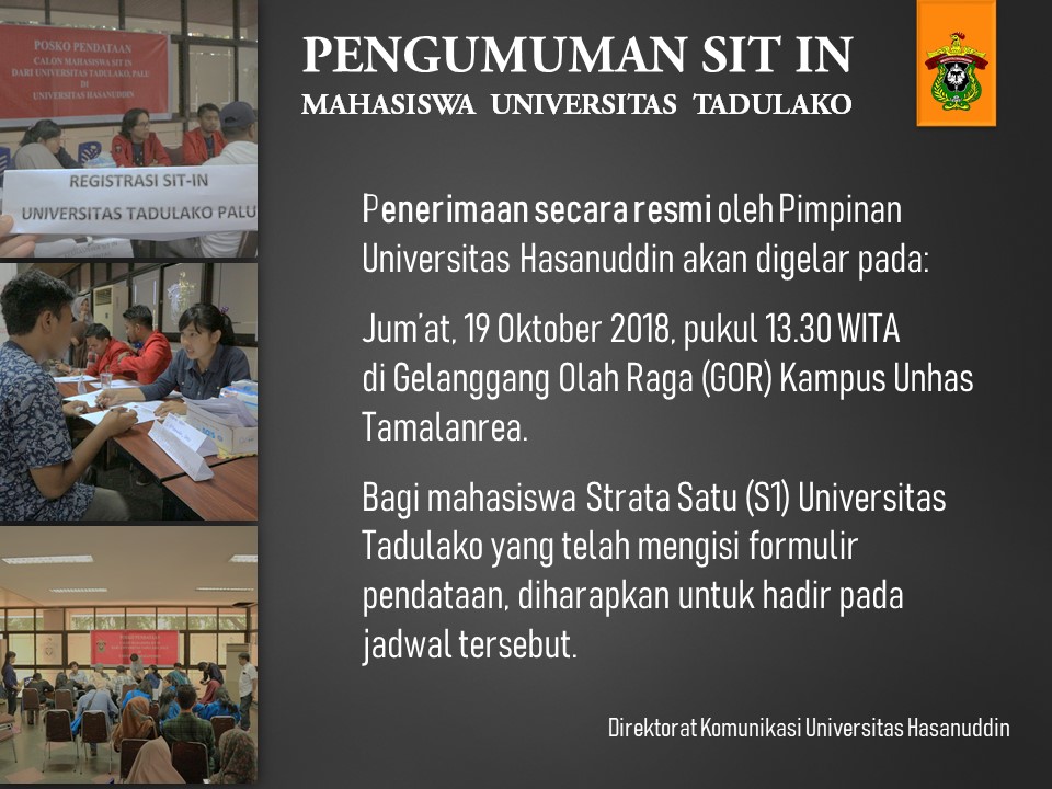 Sehubungan dengan itu, Unhas akan menggelar prosesi penerimaan Mahasiswa sit in asal Untad, yang direncanakan berlangsung pada Jum’at, 19 Oktober 2018 mendatang, pukul 13.30 WITA di GOR Unhas Tamalanrea.