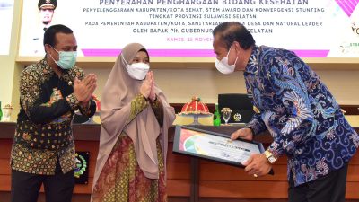 REPUBLIKNEWS.CO.ID, MAKASSAR – Pelaksana Tugas Gubernur Sulawesi Selatan (Sulsel), Andi Sudirman Sulaiman, dan Plt Ketua TP PKK Sulsel Naoemi Octarina, menyerahkan apresiasi kepada pemerintah kabupaten/kota, sanitarian, kepala desa dan natural leader di Sulsel, dalam acara Penyerahan Penghargaan Bidang Kesehatan Kesehatan Lingkup Sulsel, yang diserahkan di Ruang Rapat Pimpinan Kantor Gubernur Sulsel, Kamis (25/11/2021) kemarin.