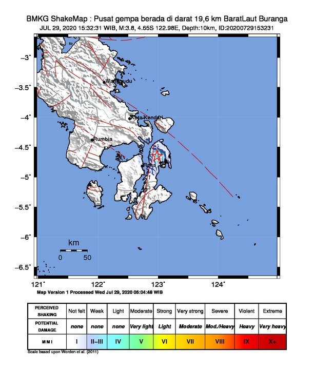Sebelumnya, dihari yang sama, Rabu (29/07/ 2020) tepatnya pada pukul 01:21 Wita, aktifitas gempa dirasakan oleh warga di Kabupaten Muna yaitu Maligano dan Pure. Juga di Kabupaten Buton Utara yakni Ereke. Gempa bumi tersebut berkekuatan 4.8 SR dengan episenter terletak pada koordinat 4.69 LS, 122.95 BT, atau tepatnya berlokasi di darat pada jarak 15.6 KM, Barat Laut Buranga pada kedalaman 10 KM terjadi akibat aktifitas sesar Buton. (Hafiz)
