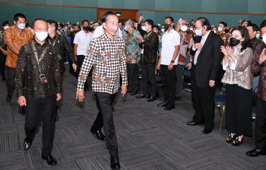 Presiden Joko Widodo menghadiri Perayaan 50 Tahun Himpunan Pengusaha Muda Indonesia (Hipmi) Tahun 2022, yang digelar di Plenary Hall, Jakarta Convention Center (JCC), Jakarta, pada Jumat, 10 Juni 2022. Pada kesempatan tersebut, Presiden berharap agar pengusaha muda yang tergabung dalam Hipmi dapat bekerja keras menghadapi tantangan-tantangan untuk membangun Indonesia.