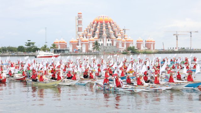Perahu nelayan dari Pulau Barrang Lompo, Barrang Caddi, Kodingareng, dan Lae-Lae mengibarkan 514 bendera kabupaten/kota se-Indonesia di Laut Losari.