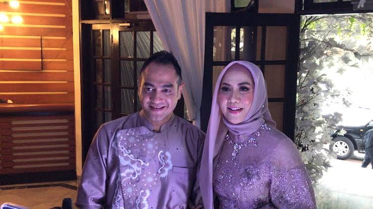 Venna Melinda tampak anggun mengenakan busana warna beige. Sedangkan Ferry tampil begitu gagah menggunakan beskap.