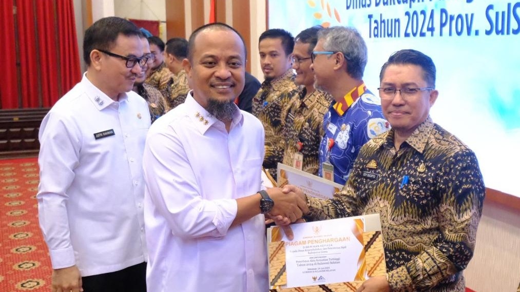 Penghargaan dari Gubernur Sulawesi Selatan ini diterima setelah Disdukcapil Gowa menjadi layanan pencatatan kependudukan yang dinilai paling aktif dalam mendata akta kematian masyarakatnya sepanjang periode 2024. Penghargaan tersebut diserahkan langsung Gubernur Sulawesi Selatan, Andi Sudirman Sulaiman kepada Kadisdukcapil Kabupaten Gowa, Edy Sucipto.