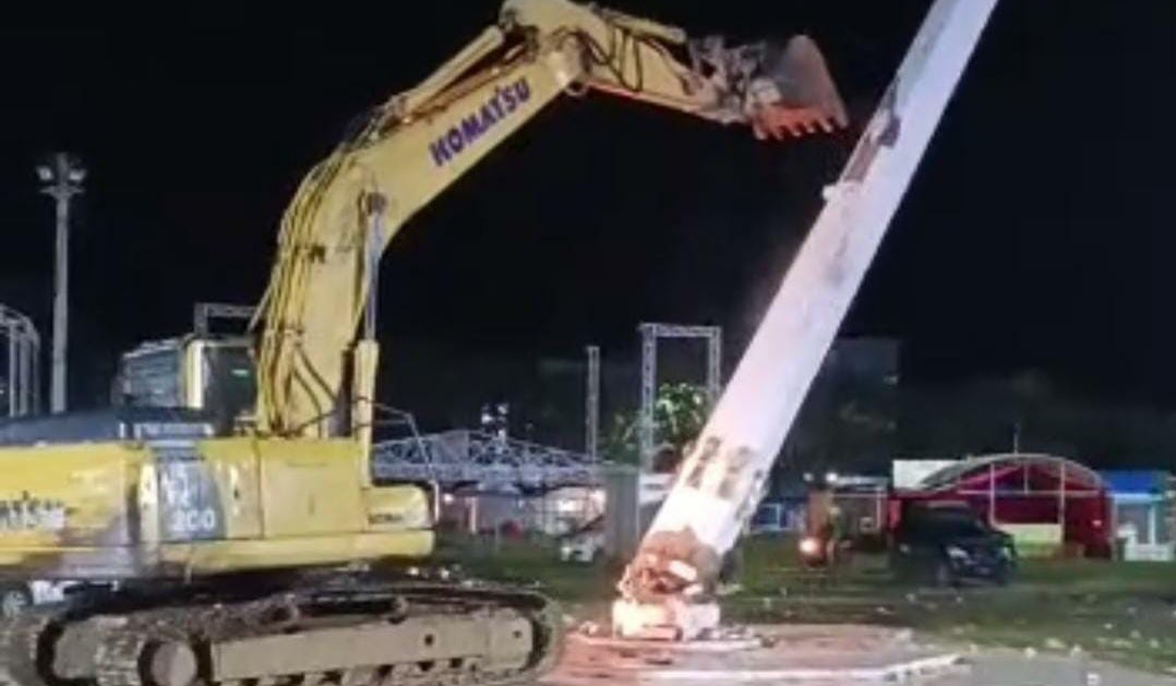 Menggunakan alat berat Eksavator dari Dinas Pekerjaan Umum dan Perumahan Rakyat (PUPR) Kabupaten Sinjai, Tiang Bendera yang berpuluh tahun berdiri tegak itu dirobohkan untuk rencana pembuatan Alun-alun.