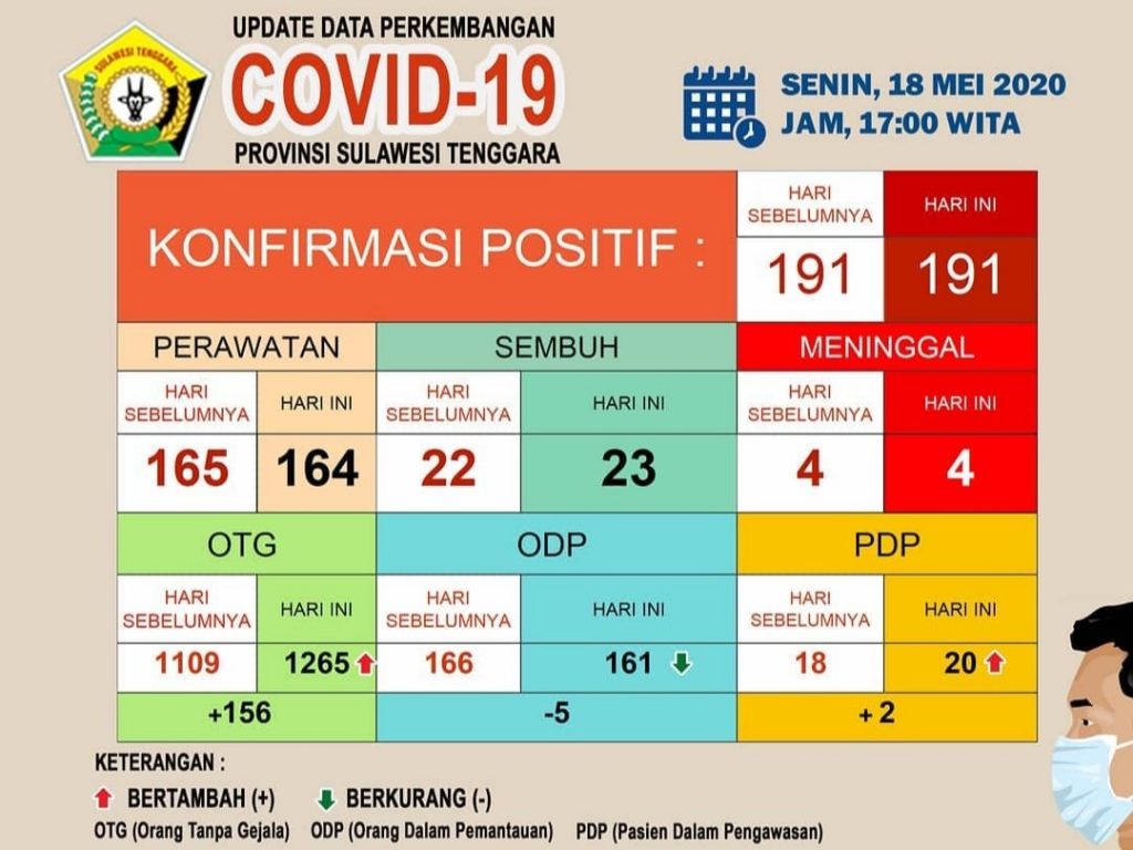 Dari tabel data yang di umumkan oleh gugus tugas provinsi Sultra , Orang Tanpa Gejala (OTG) bertambah 156 menjadi 156, Orang Dalam Pemantauan (ODP) berkurang 5 menjadi 161 dan Pasien Dalam Pengawasan (PDP) bertambah 2 menjadi 20.