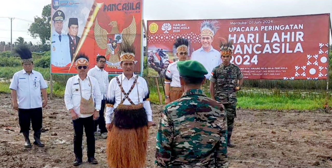 REPUBLIKNEWS.CO.ID, MERAUKE — Menteri Pertanian Republik Indonesia Andi Amran Sulaiman memimpin upacara peringatan Hari Lahir Pancasila ke-79 yang digelar di tengah areal persawahan di Kampung Sumber Harapan SP-3 Distrik Tanah Miring Kabupaten Merauke, Papua Selatan, Sabtu (01/06/2024).