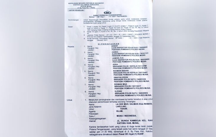 Ia melapor di Polres Muna bahwa telah terjadi tidak pidana penganiayaan sesuai dengan laporan polisi nomor : LP/B/216/IX/2021/SPKT/RES MUNA/POLDA SULTRA tanggal 30 September 2021.