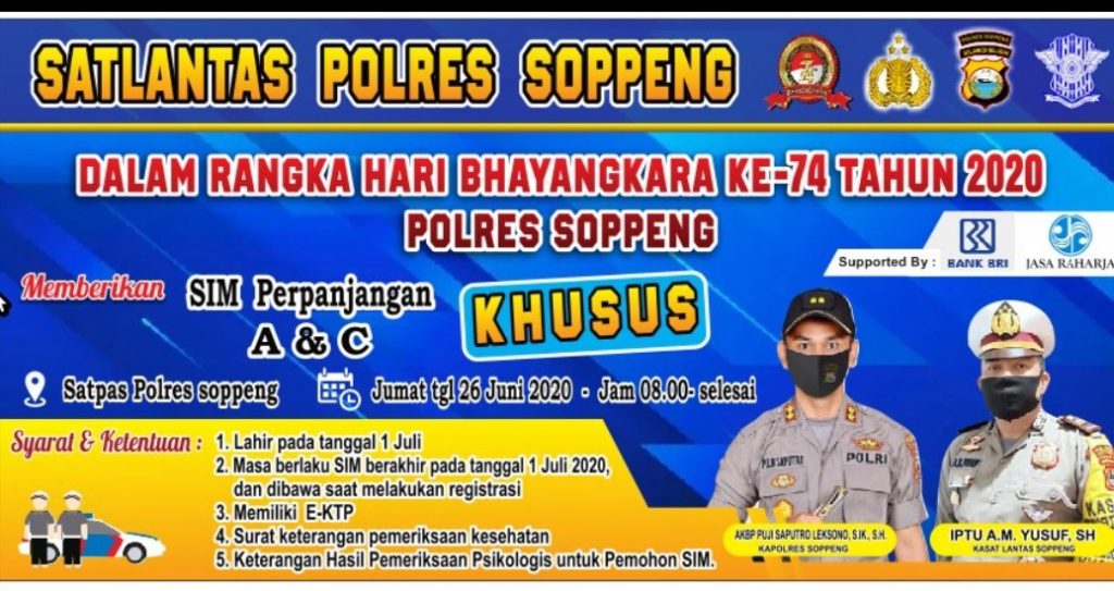 REPUBLIKNEWS.CO.ID, SOPPENG — Menyambut perayaan Hari Bhayangkara ke-74 tahun 2020, Kepolisian Republik Indonesia (Polri) memprogramkan perpanjangan Surat Izin Mengemudi (SIM) bagi warga yang lahir pada tanggal 1 Juli.