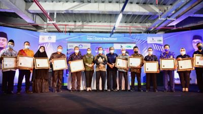 REPUBLIKNEWS.CO.ID, MAKASSAR — Plt Gubernur Sulawesi Selatan Andi Sudirman Sulaiman, menghadiri peringatan Hari Guru Nasional Tingkat Provinsi Sulsel, yang dilaksanakan di Mall Nipah, Kamis (25/11/2021). Didampingi Plt Kepala Dinas Pendidikan Sulsel Imran Jausy, Andi Sudirman memberikan penghargaan kepada Tenaga Pendidik dan Kependidikan serta kepada Kabupaten dan Kota yang telah melaksanakan vaksinasi lebih 70 persen, sekaligus menyerahkan bantuan peralatan Smart School.