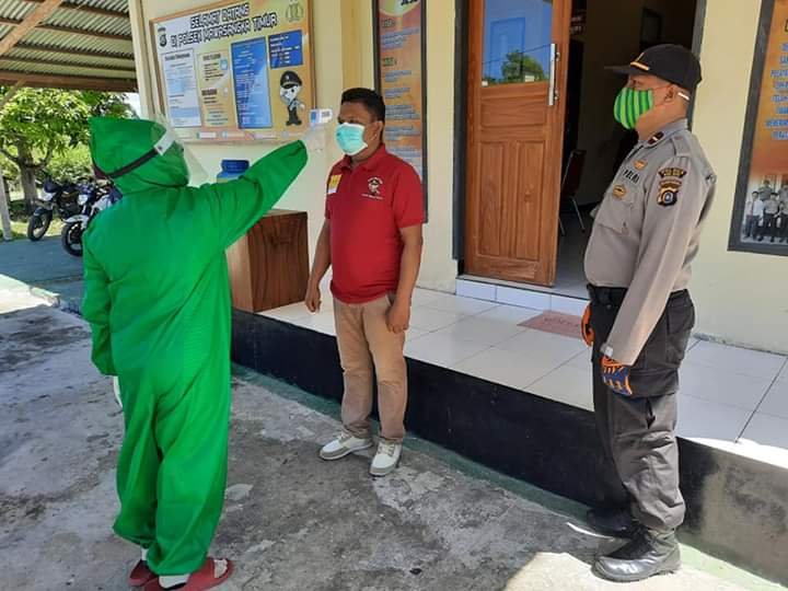 “Pengecekan suhu tubuh dengan menggunakan thermo gun/thermo infrared melalui scanner diarahkan ke mata personel. Alhamdulillah diperoleh hasil bahwa suhu tubuh semua personel normal (rata-rata 36,5 °C),” kata Kapolsek Mawasangka Timur, IPDA Musrifin kepada republiknews.co.id.