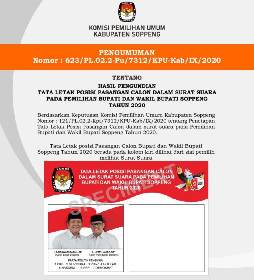 Contoh Surat Suara Pilkada Soppeng 2020.