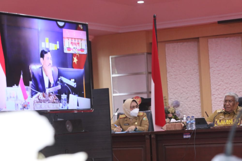 Rapat Pengembangan dan Peningkatan Penggunaan Aspal Buton dalam Negeri melalui video konferens yang dipimpin oleh Menko Marves Luhut Binsar Pandjaitan. Foto: Kominfo Sultra