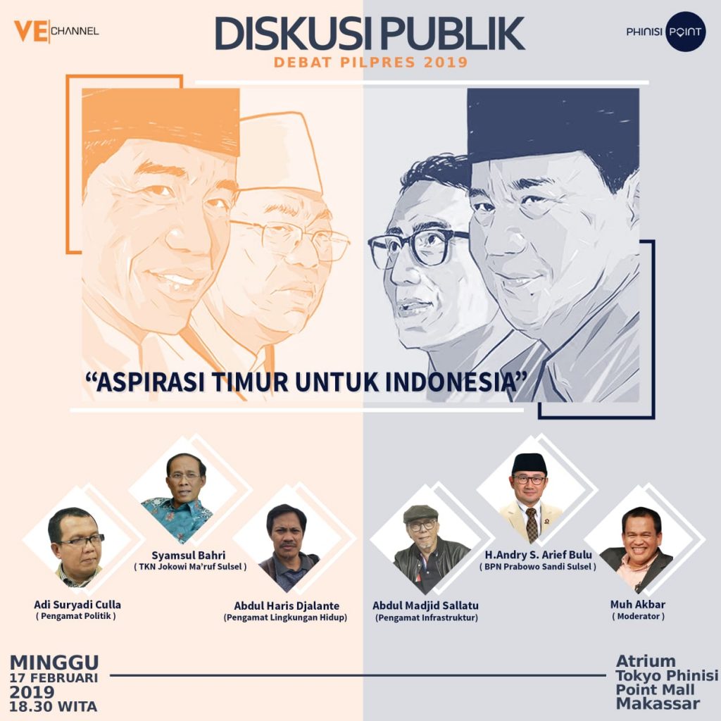 REPUBLIKNEWS.CO.ID, MAKASSAR — Jelang Devat Kandidat Calon Presiden dan Wakil Presiden Republik Indonesia tahap ke-2, Ve Cahannel (TV Lokal Makassar) bekerja sama dengan Phinisi Point Mall Makassar akan menggelar diskusi publik dengan menghadirkan, Ketua Tim Kampanye Daerah (TKD) Sulsel Jokowi-Ma’ruf, Syamsul Bachri, Juru bicara badan pemenangan Nasinal (BPN) Prabowo-Sandi, Andry Arief Bulu, Pengamat politik Unhas, Adi Suryadi Culla, Pengamat Lingkungan Hidup, Abdul Haris Djalante.