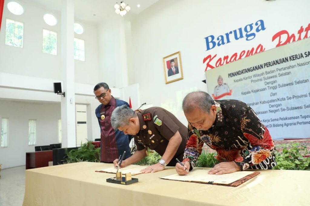 Nota kesepahaman tentang Koordinasi dan Kerjasama Pelaksanaan Tugas dan Fungsi dalam Rangka Penegakan Hukum dan Pemulihan Aset di Bidang Agraria/Pertanahan dan Tata Ruang itu juga diteken Kepala Kejari dan Kepala BPN se Sulsel.