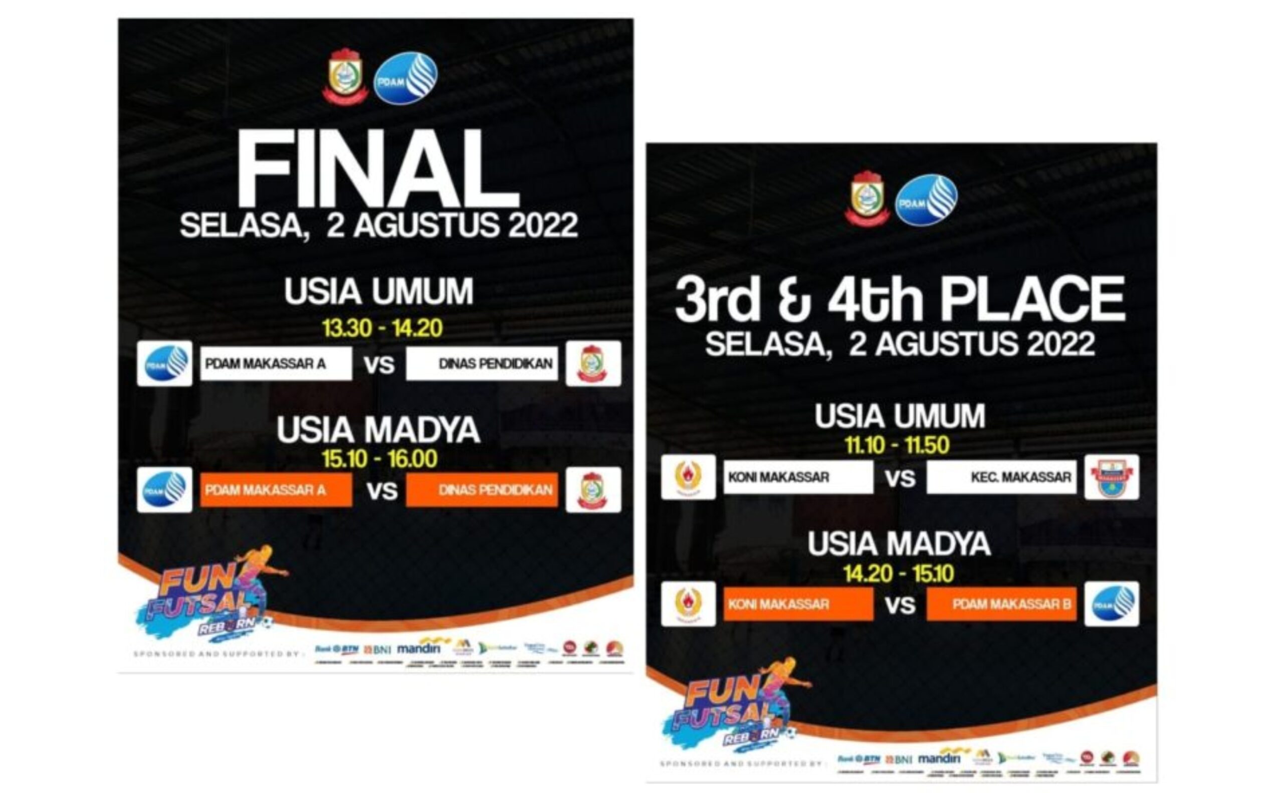 Sementara itu Koordinator Bidang Olahraga, Ary Rangkuti menjelaskan hari ini ada 4 pertandingan yakni Final dan semifinal. Final ada 4 Tim karena ada 2 Kategori yakni Umum (PDAM Makassar A VS Dinas Pendidikan) dan Madya usia diatas 35 tahun, juga mempertemukan PDAM Makassar A VS Dinas Pendidikan.