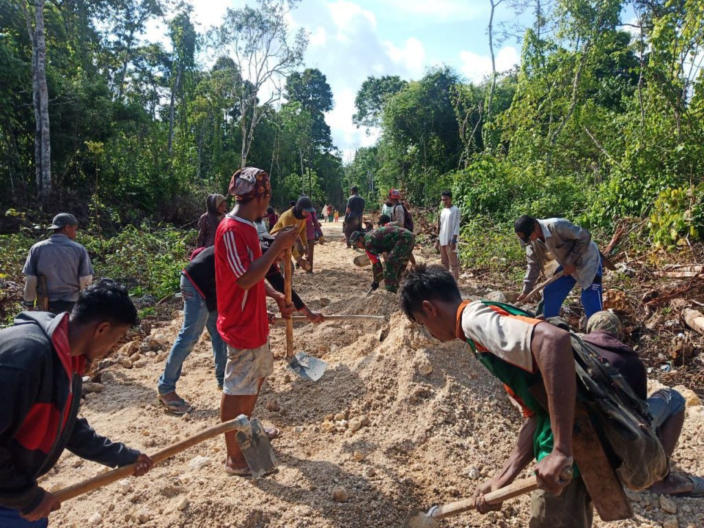 Babinsa Koramil 1413-04/Mawasangka Serda La Ode Iwan bergotong royong bersama Masyarakat bangun jalan tani di Desa Polindu. Foto: istimewa