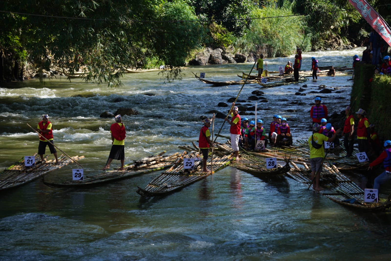Kegiatan berlangsung meriah yang diramaikan oleh 35 tim, dan sebagian mereka unjuk kebolehan saat memainkan Bamboo Rafting.