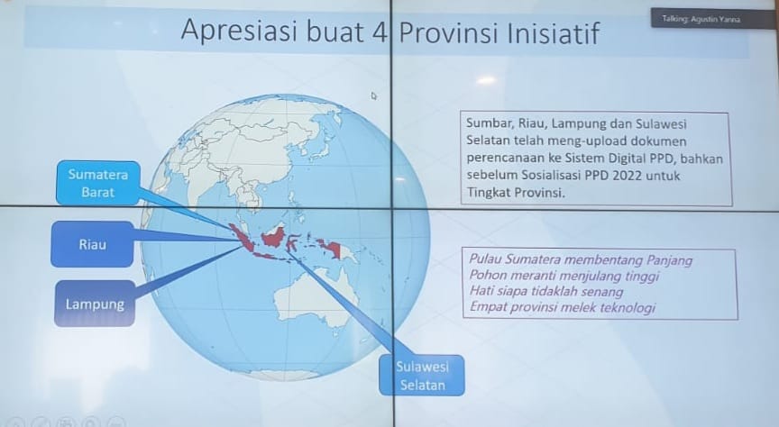 “Kami memberikan apresiasi buat empat provinsi yang berinisiatif telah mengupload dokumen perencanaan ke sistem digital PPD, bahkan sebelum sosialisasi PPD 2022 untuk tingkat provinsi. Yakni Sulawesi Selatan, Sumatera Barat, Riau, dan Lampung,” ungkapnya.