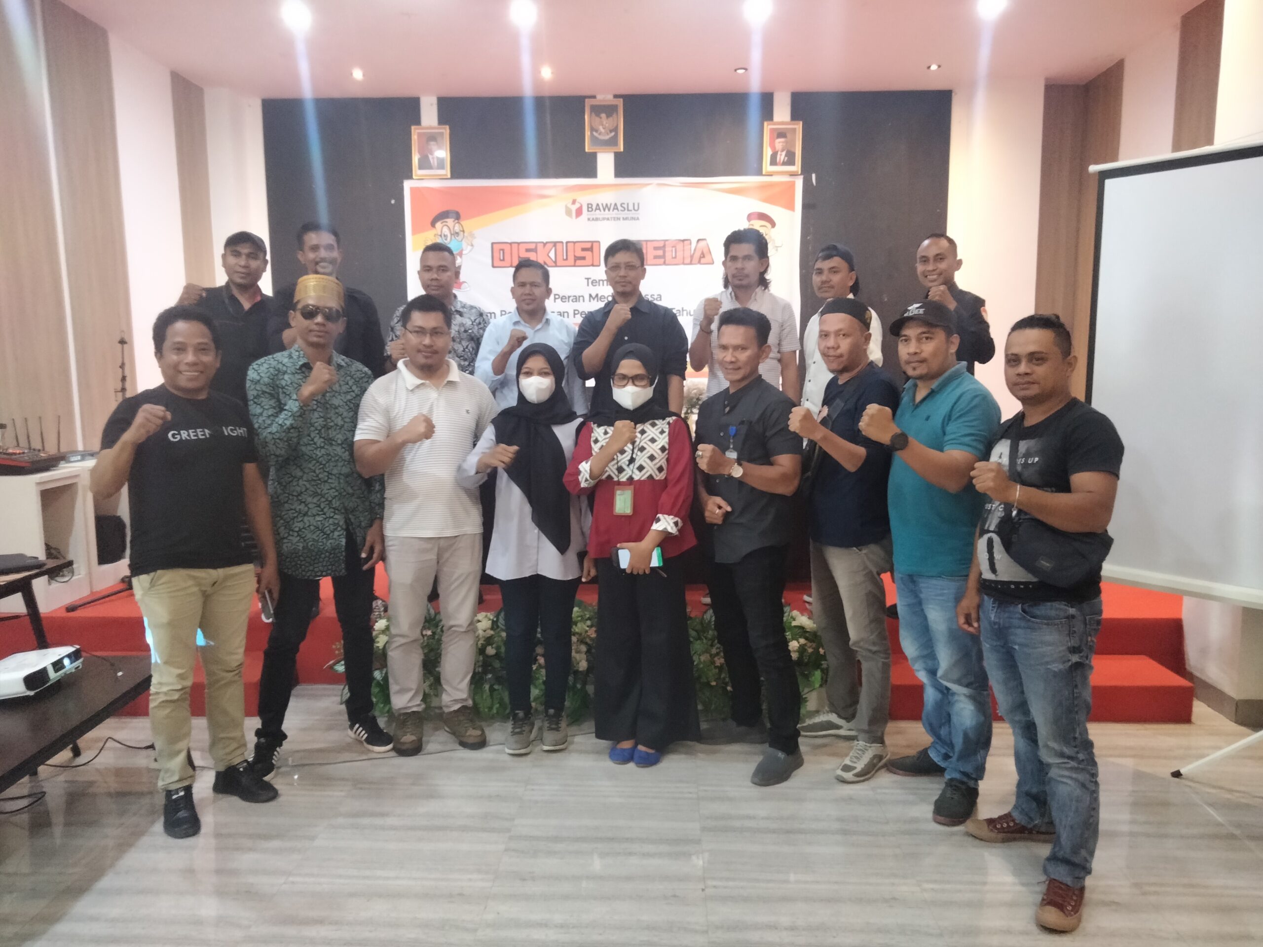 bersama anggota Bawaslu Muna, sejumlah Jurnalis di Kota Raha dan narasumber Daniel Zuchron selaku rektor Institut Teknologi Bisnis Visi Nusantara Bogor yang dulu menjabat sebagai anggota Bawaslu RI periode 2012-2017.