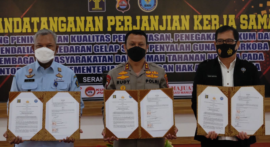 “Adapun maksud perjanjian kerja sama ini untuk meningkatkan kolaborasi dan sinergitas antara Kantor Wilayah Kementerian Hukum dan Hak Asasi Manusia Banten, Kepolisian Daerah Banten, dan Badan Narkotika Nasional Provinsi Banten dalam rangka pengawasan, penegakan hukum dan pengendalian peredaran gelap serta penyalahgunaan narkoba khususnya pada lembaga pemasyarakatan, rumah tahanan negara dan satuan kerja Kemenkumham Banten,” kata Rudy.