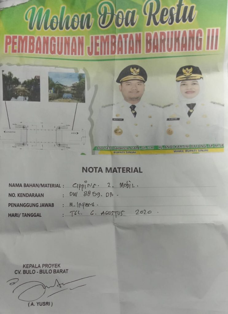 Nota Material yang bergambarkan Bupati-Wakil Bupati Sinjai dengan tulisan ‘Mohon Doa Restu Pembangunan Jembatan Barukang III’ menjadi topik hangat dikalangan masyarakat Sinjai. Bahkan banyak yang menilai Marwah Bupati-Wakil Bupati Sinjai sengaja diobok-obok terkait terpampangnya Foto Pemerintah Kabupaten Sinjai di Nota Material perusahaan yang tengah mengerjakan Proyek.