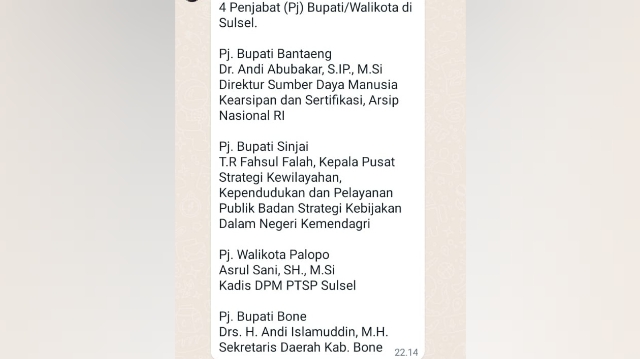 REPUBLIKNEWS.CO.ID, SINJAI — Beredar pesan berantai melalui aplikasi WhatsApp yang menyebutkan nama-nama 4 Penjabat (Pj) Kepala Daerah Kabupaten/Kota di Sulawesi Selatan. Nama Penjabat Bupati tersebut salah satunya Kabupaten Sinjai.