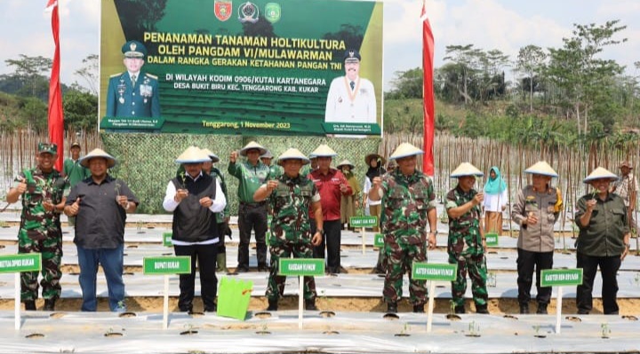 Kegiatan Karya Bhakti dan Gerakan Nasional Ketahanan Pangan 2023 merupakan program kolaboratif TNI, pemkab Kukar, dan Gapoktan Bukit Biru. Tujuan utamanya adalah meningkatkan produktivitas dan kesejahteraan petani. Program ini juga terintegrasi dalam TNI Manunggal Masuk Desa (TMMD) serta Karya Bhakti untuk meningkatkan ketahanan pangan dan kesejahteraan masyarakat. (ADV/Kutai Kartanegara)