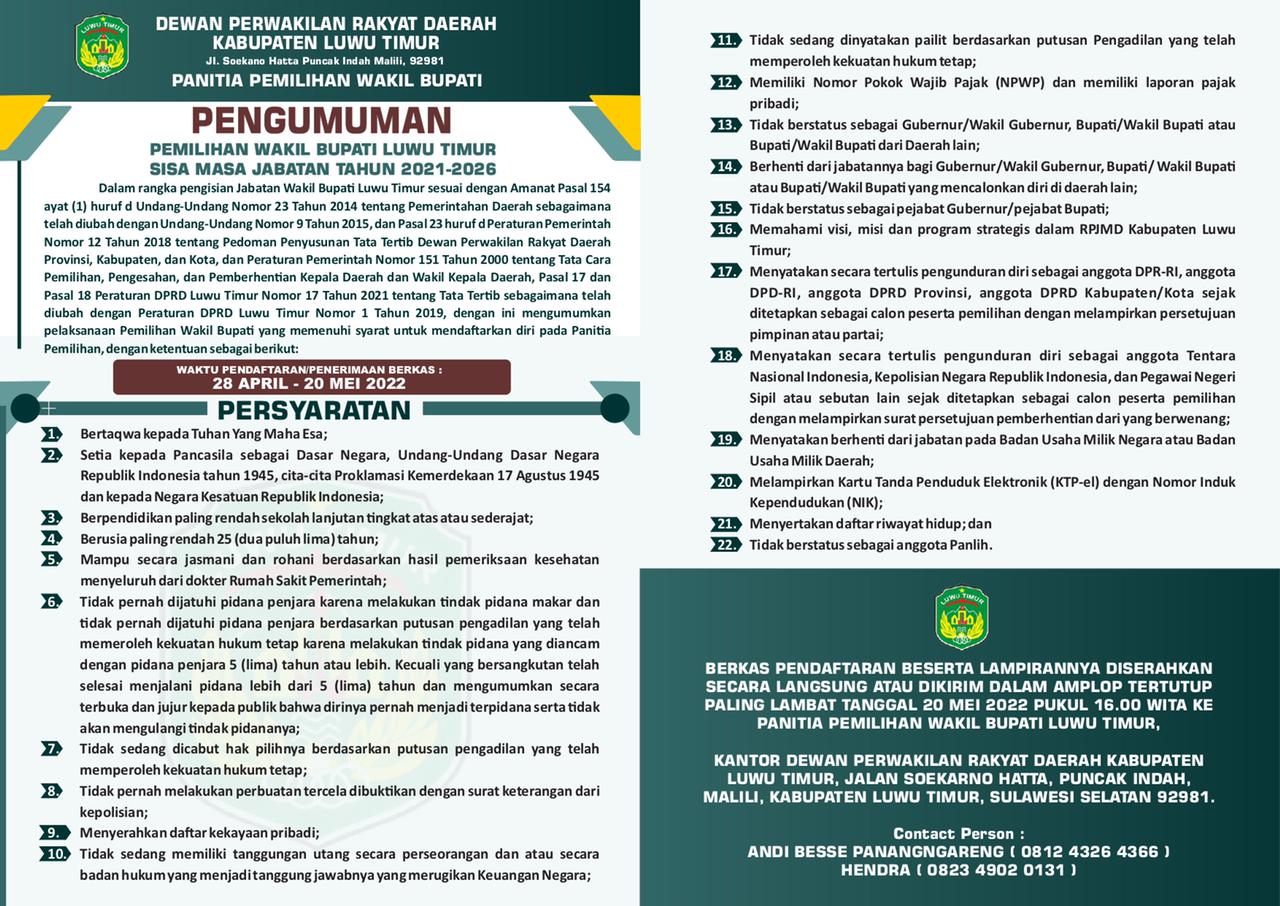 REPUBLIKNEWS.CO.ID, LUWU TIMUR – Dewan Perwakilan Rakyat Daerah (DPRD) Kabupaten Luwu Timur hari ini, resmi mengumumkan pendaftaran calon wakil Bupati Luwu Timur, Kamis (7/4/2022).