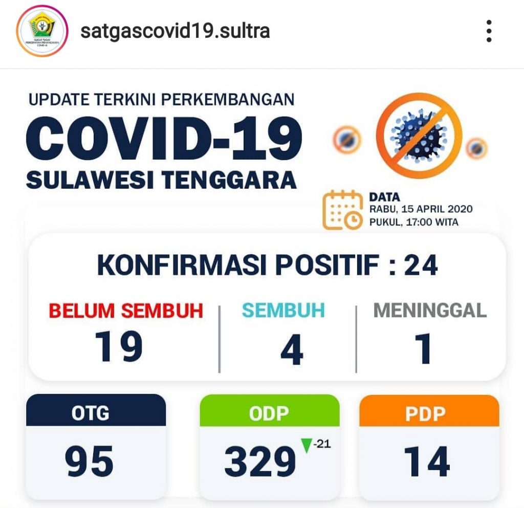 “Total kasus konfirmasi positif corona pada Rabu, 15 april 2020 terdiri dari 8 kasus baru dan 11 kasus lama, ditambah 4 orang yang sembuh dan 1 kasus meninggal, jadi totalnya 24 kasus positif virus Corona atau Covid-19 di Sultra,” ujarnya.