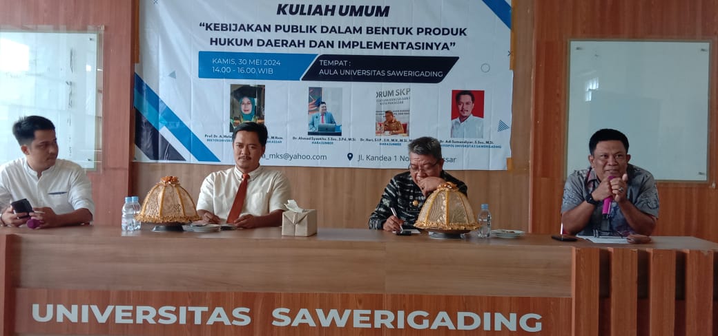 Kegiatan bertema “Kebijakan Publik Dalam Bentuk Produk Hukum Daerah dan Implementasinya” ini menghadirkan pihak birokrasi Pemkot Makassar, Dr. Hari, S.I.P, S.H., M.H, M. Si, M. I. Kom, dan pihak akademisi yang juga mantan birokrasi di Pemprov Sulsel, Dr. Ahmad Syaekhu, S. Sos. M. Pd., M. Si., selaku dosen Administrasi Publik Unsa Makassar.