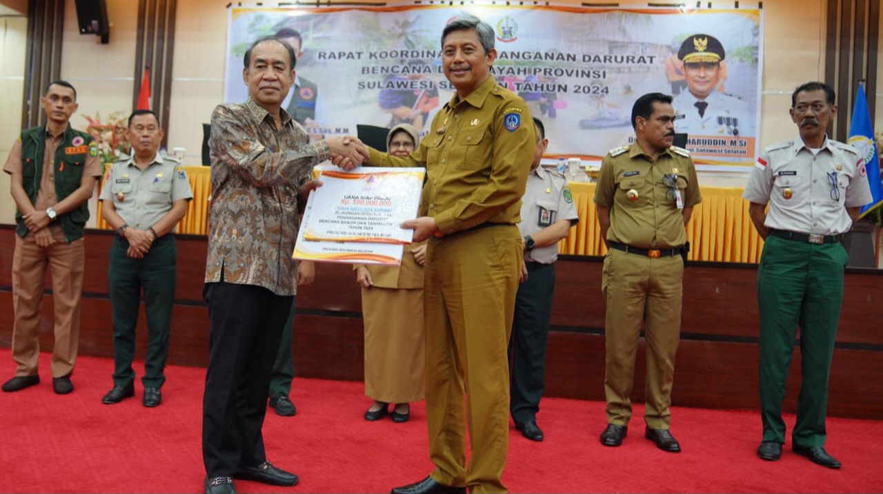Penyerahan simbolis dilakukan pada Rapat Koordinasi Penanganan Darurat Bencana di Wilayah Provinsi Sulawesi Selatan Tahun 2024, di Ruang Pola Kantor Gubernur Sulsel, Senin (06/05/2024).