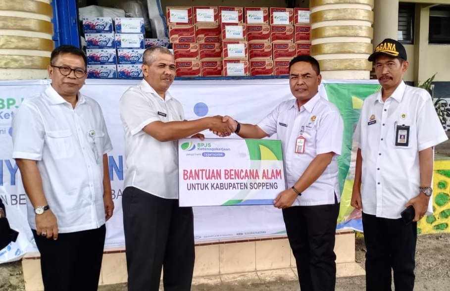 Bantuan yang salurkan senilai Rp. 37.850.000 tersebut diserahkan oleh Kepala Kantor Ketenagakerjaan Cabang Makassar Dodit Isdiyono, kepada Asisten Administrasi Setda Soppeng di Halaman Kantor Bupati Soppeng, Rabu (05/02/2020).