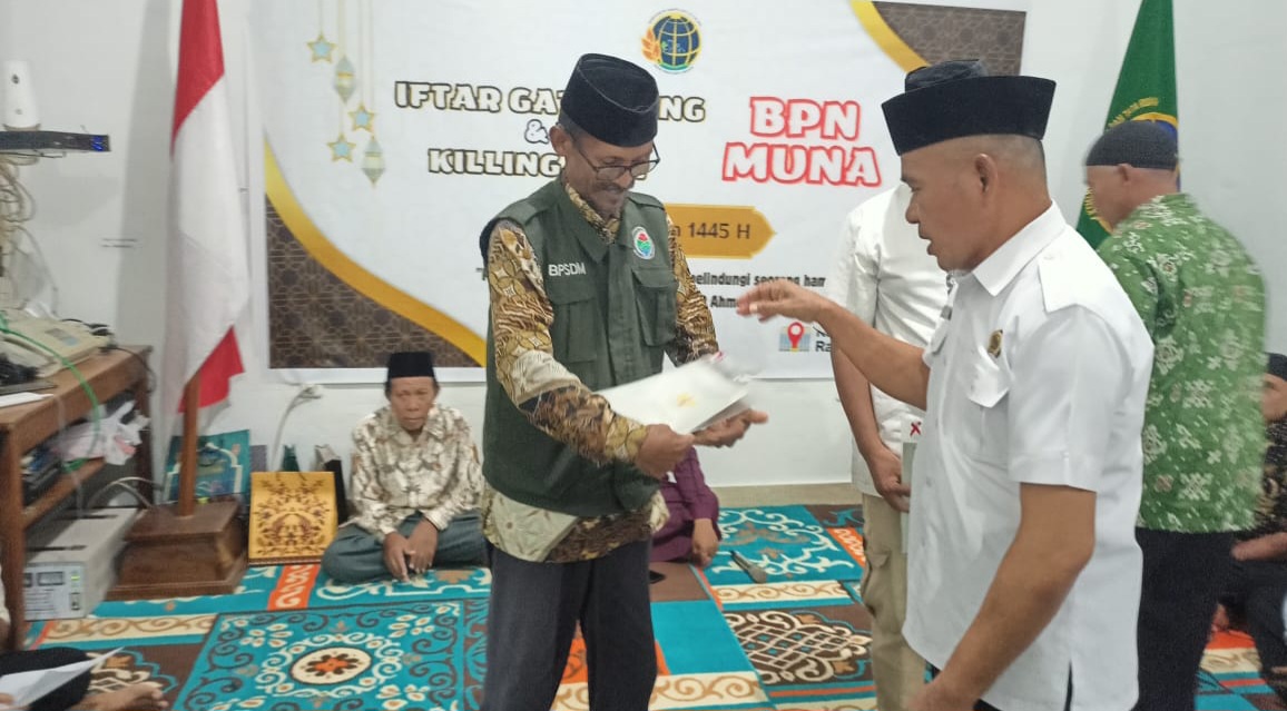 REPUBLIKNEWS.CO.ID, MUNA — Kantor Badan Pertanahan Nasional (BPN) Kabupaten Muna, Sulawesi Tenggara (Sultra), menyerahkan lima sertifikat tanah wakah Masjid sekaligus melaksanakan Buka Puasa bersama di kantornya, Rabu (27/03/2024).