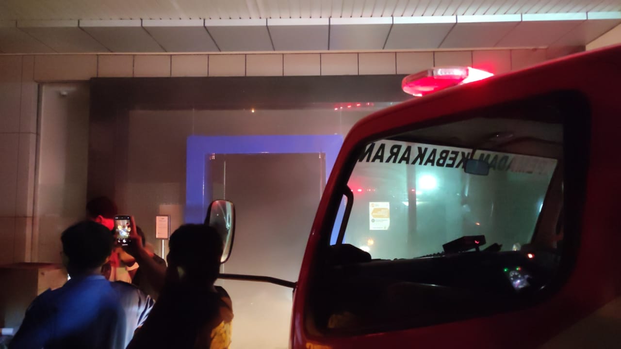 Asap memenuhi ruangan lantai dasar Kantor BRI, usai dilakukan pemadaman Api menggunakan Alat Pemadam Api Ringan (APAR) oleh pihak Security Bank BRI.