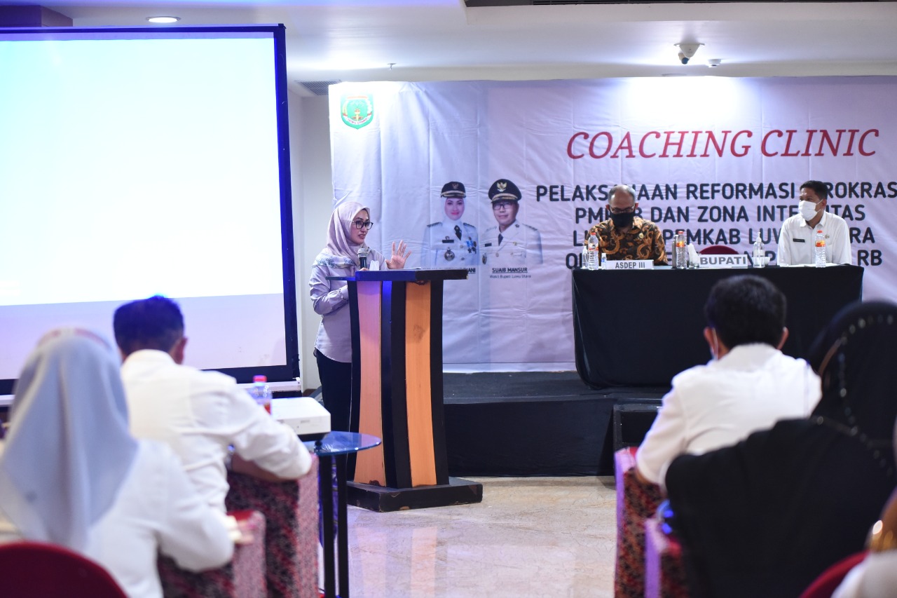 REPUBLIKNEWS.CO.ID,MAKASSAR — Bupati Luwu Utara Indah Putri Indriani membuka langsung Coaching Clinic pelaksanaan Reformasi Birokrasi PMPRB dan Zona Integritas lingkup pemerintah Kabupaten luwu utara oleh kementrian PAN RB. Indah menegaskan target dari kegiatan ini adalah penigkatan kualitas pelayanan kepada masyrakat. Rabu (25/05/2022)
