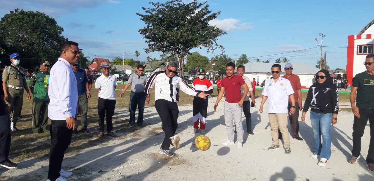Pj. Bupati Buteng Muhammad Yusup saat melakukan tendangan bola kehormatan sebagai tanda dimulainya Matana Sorumba Cup I, Minggu (21/08/2022).