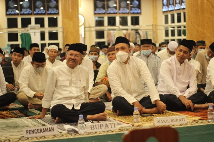 Bupati Iksan Iskandar menghadiri kegiatan keagamaan tersebut bersama beberapa pejabat daerah lainnya dengan menggunakan pakaian muslim putih dan peci hitam