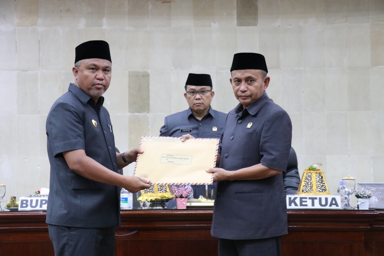 Rapat Paripurna tersebut dipimpin langsung oleh Ketua DPRD Luwu Timur, Aripin didampingi Wakil Ketua, HM. Siddiq BM, dihadiri segenap anggota DPRD, unsur TNI/Polri, Staf Ahli dan para kepala OPD lingkup Pemkab Luwu Timur.