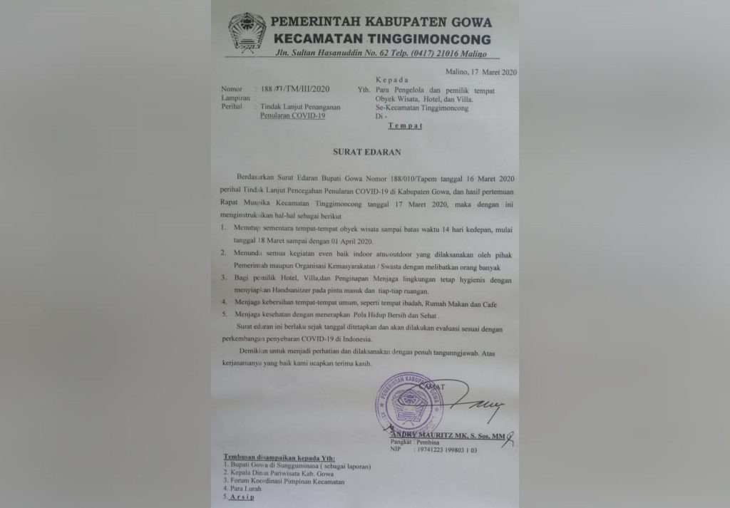 REPUBLIKNEWS.CO.ID, GOWA – Setelah Bupati Gowa mengeluarkan Surat Edaran tindaklanjut pencegahan penularan Covid-19 atau lebih dikenal dengan sebutan virus Corona di Kabupaten Gowa, Pemerintah Kecamatan Tinggimoncong turut mengambil langkah cepat yakni menutup semua obyek wisata di Tinggimoncong selama 14 hari kedepan terhitung mulai 18 Maret hingga 1 April 2020 mendatang.