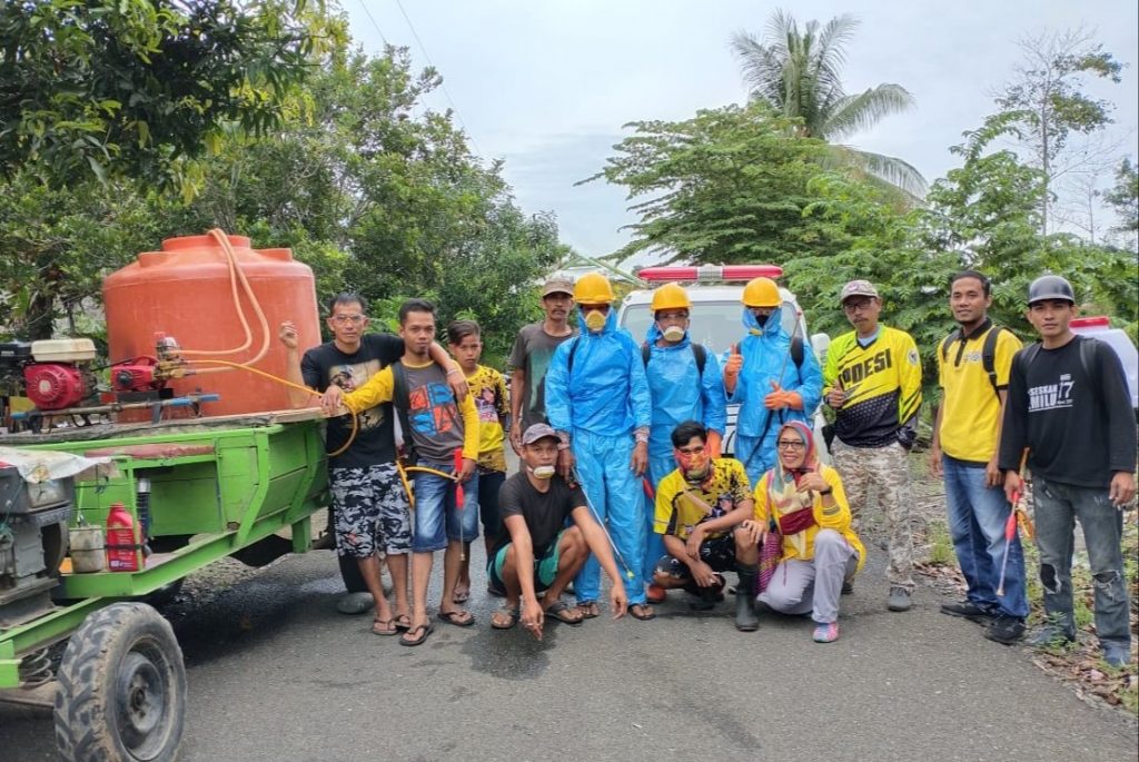 Penyemprotan berupa desinfektan untuk mencegah penyebaran virus Covid-19 yang dipimpin langsung oleh Kepala Desa Tinco, Mannahawu.