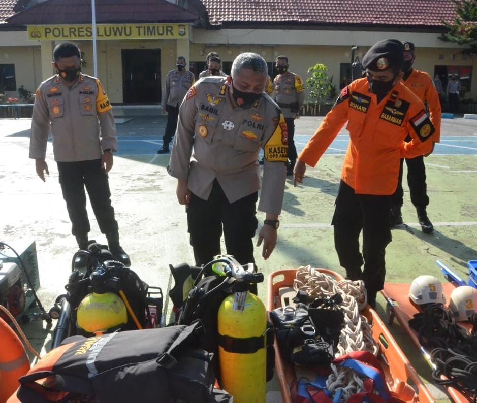 Kapolres Luwu Timur AKBP Indratmoko mendampingi ketua tim supervisi Kabag Bin Ops Biro Ops Polda Sulsel AKBP Sabil Umar yang memimpin langsung pengecekan peralatan SAR menghadapi bencana alam.
