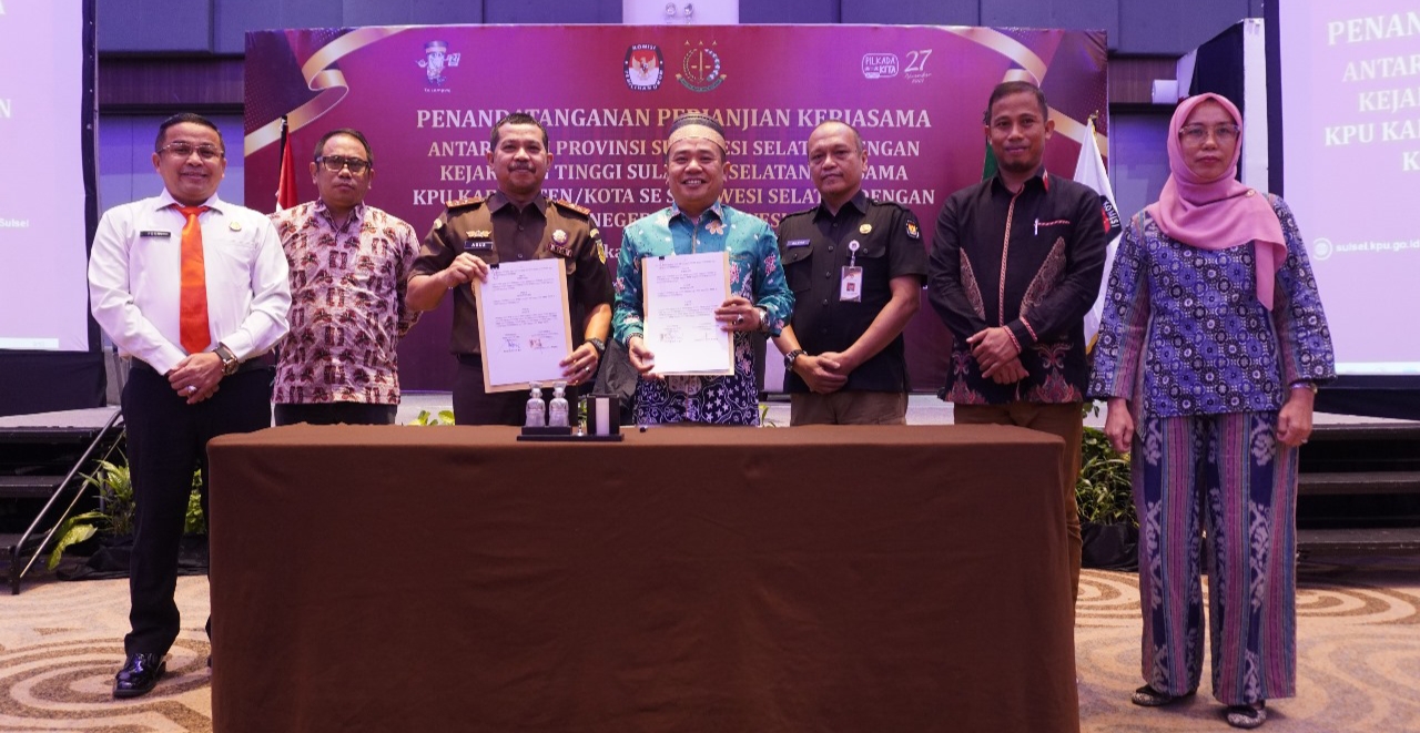 REPUBLIKNEWS.CO.ID, MAKASSAR – Kejaksaan Tinggi (Kajati) Sulawesi Selatan menandatangani perjanjian kerjasama dengan KPU Provinsi Sulawesi Selatan dan KPU kabupaten/kota se Sulawesi Selatan, serta Kejaksaan Negeri se Sulawesi Selatan. Penandatanganan kerjasama itu dilaksanakan di Hotel Four Points by Sheraton, Jalan Andi Djemma, Makassar, Rabu (10/7/2024).