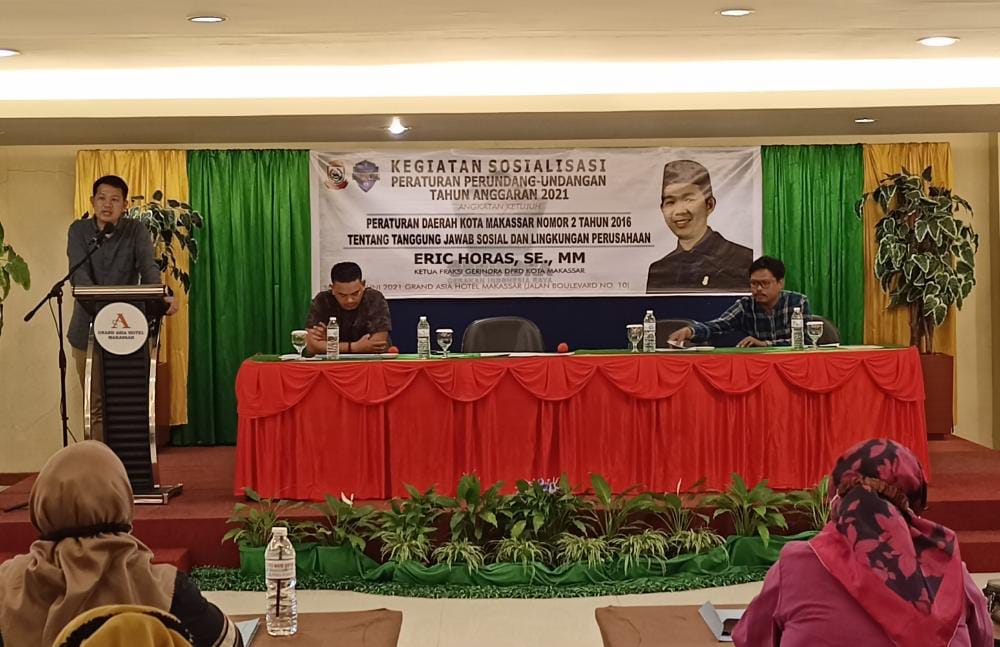 REPUBLIKNEWS.CO.ID, MAKASSAR – Anggota DPRD Kota Makassar Eric Horas, menggelar kegiatan sosialisasi peraturan perundang-undangan atau Perda Kota Makassar Nomor 2 Tahun 2016 tentang Tanggung Jawab Sosial dan Lingkungan Perusahaan (TSLP). Bertempat di Hotel Grand Asia, Jalan Boulevard, Makassar, Selasa (8/6/2021) malam.