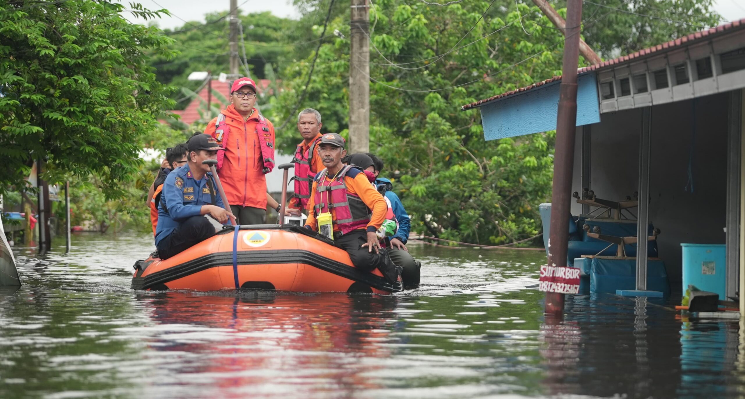 Meninjau banjir menggunakan perahu karet, Danny Pomanto didampingi Camat Manggala Andi Eldi Indra, Kepala Pelaksana BPBD Hendra Hakamuddin, dan Kepala Dinas Pekerjaan Umum (PU) Zuhaelsi Zubir.