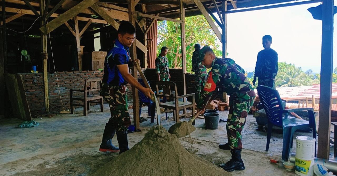 Pada kesempatan tersebut, Dandim bukan hanya meninjau dan mengawasi, tetapi juga ikut berbaur dan mengaduk campuran semen bersama anggota Satgas.