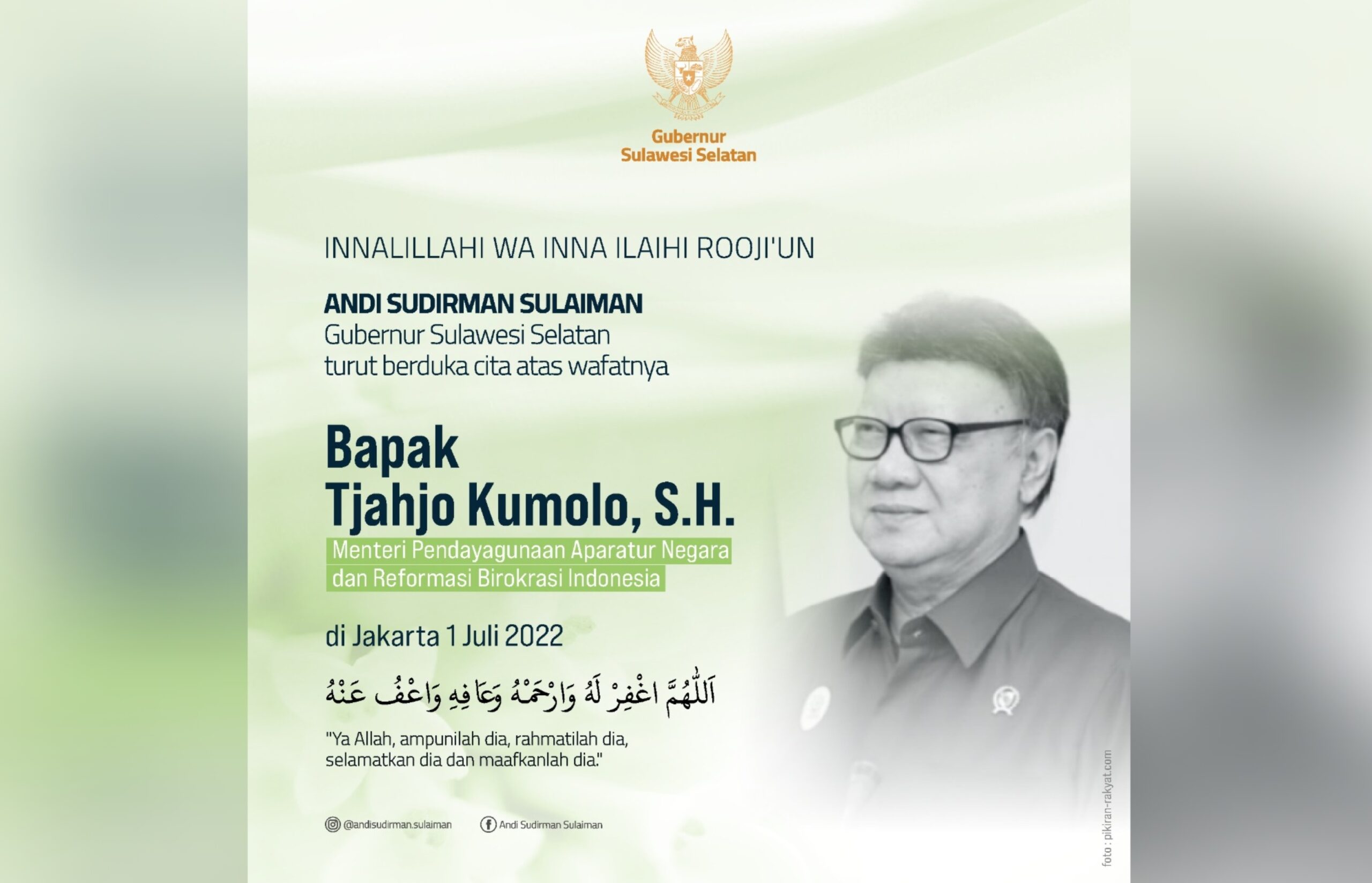 REPUBLIKNEWS.CO.ID, MAKASSAR – Gubernur Sulawesi Selatan, Andi Sudirman Sulaiman menyampaikan duka cita mendalam atas meninggalnya Menteri Pendayagunaan Aparatur Negara dan Reformasi Birokrasi (Menpan RB) Tjahjo Kumolo.