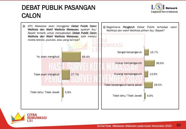 Berdasarkan data Cikom LSI, sebagian besar pemilih tertarik menyaksikan debat publik, baik itu melalui media televisi, YouTube maupun lainnya. Terdapat 66,4% responden yang mengaku tertarik menonton debat publik antara empat paslon di Makassar. Sisanya, 27,7% responden memastikan tak tertarik dan 5,9% responden menjawab tidak tahu.