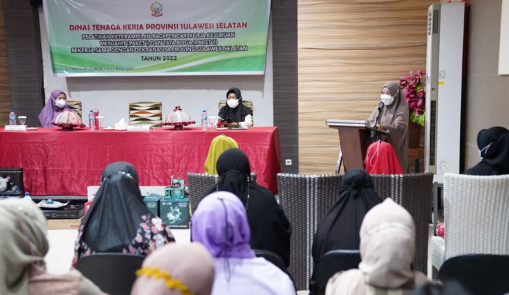 REPUBLIKNEWS.CO.ID, MAKASSAR — Ketua Dewan Kerajinan Nasional Daerah (Dekranasda) Sulsel Naoemi Octarina, membuka pelatihan keterampilan bagi pencari kerja kejuruan menjahit (Paket I) dan Tata Boga (Paket II) Bekerjasama dengan Dekranasda provinsi Sulsel tahun 2022 yang dilaksanakan di hotel Tree, jalan Pandang Raya, Rabu (23/03/2022) kemarin.