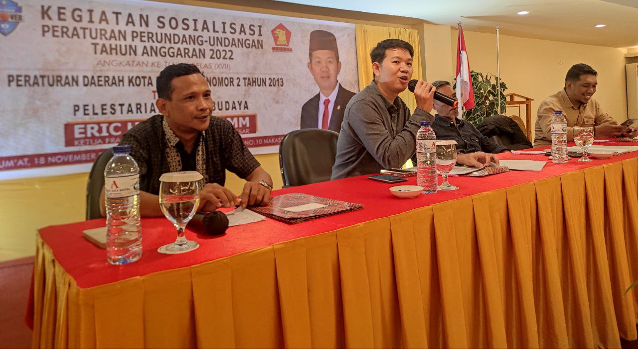 Hal ini dipahami betul oleh Anggota DPRD Kota Makassar, Eric Horas. Demi ikut berpartisipasi menjaga kelestarian budaya, ia menggelar kegiatan sosialisasi Peraturan Daerah (Perda) Kota Makassar Nomor 2 Tahun 2013 tentang Pelestarian Cagar Budaya.